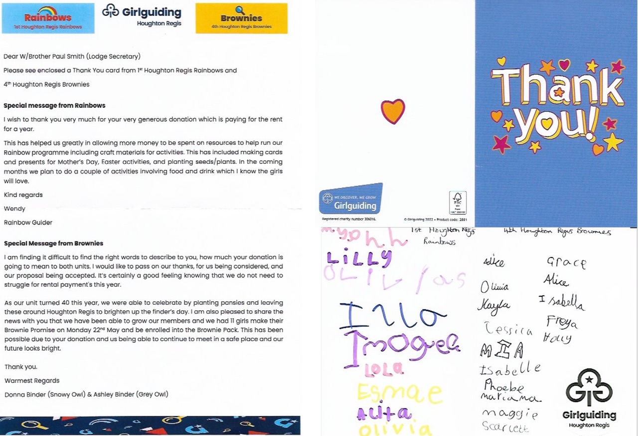 At the Elstow Lodge Annual BBQ on Sunday, the Lodge Members were delighted to receive a lovely, personally delivered, thank-you card and letter from the 1st Houghton Regis Rainbows and the 4th Houghton Regis Brownies.