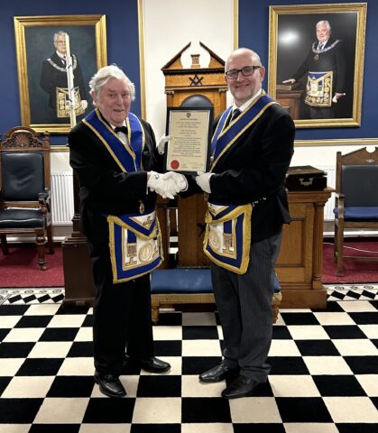 However, the highlight of the evening was when John Bartram received a certificate in respect of his 50 years in Freemasonry. It was presented by Mike Freeley, Provincial Senior Grand Warden, representing the Provincial Grand Master, who, after having reminded everyone of other events in 1974, commented how good it was to share in the extremes of Masonic service.