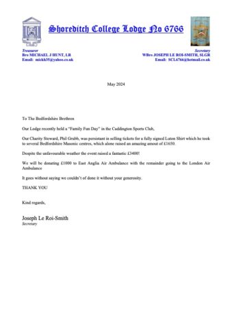 During the early part of this year, many of you will have met with Phil Grubb, a member of Shoreditch College Lodge, in London, as he visited the Bedfordshire Centres promoting the Caddington Family Fun Day & selling raffle tickets to win a signed Luton Town Football shirt.
